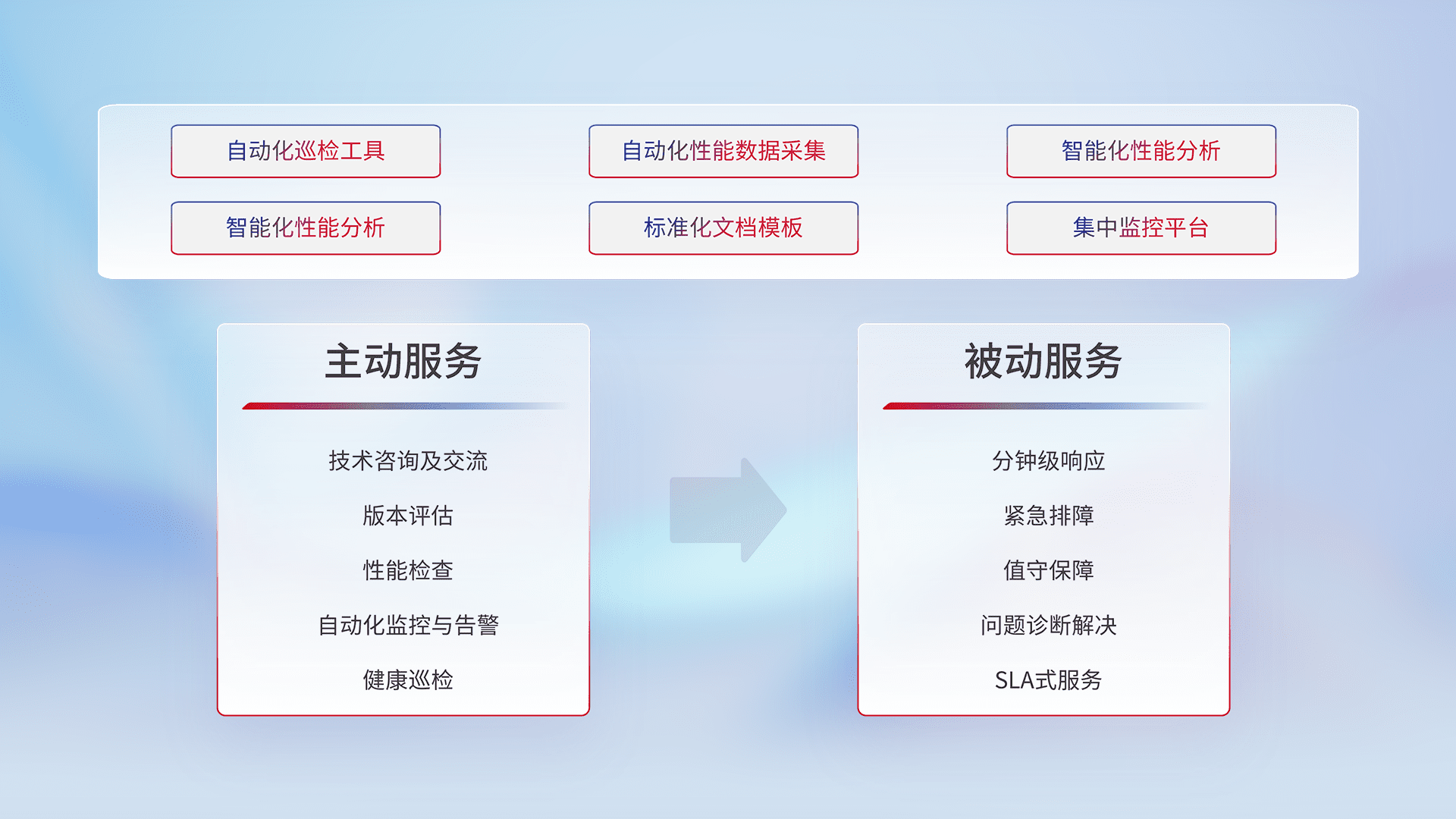智能化工具和标准化文档,,,,保障服务质量,,提供主动服务(包含技术咨询、、、版本评估、、性能检查、、、、自动化监控与告警、、健康巡检)和被动服务包含(分钟级响应、、、紧急排障、、值守保障、、问题诊断解决、、、、SLA服务)。。。
