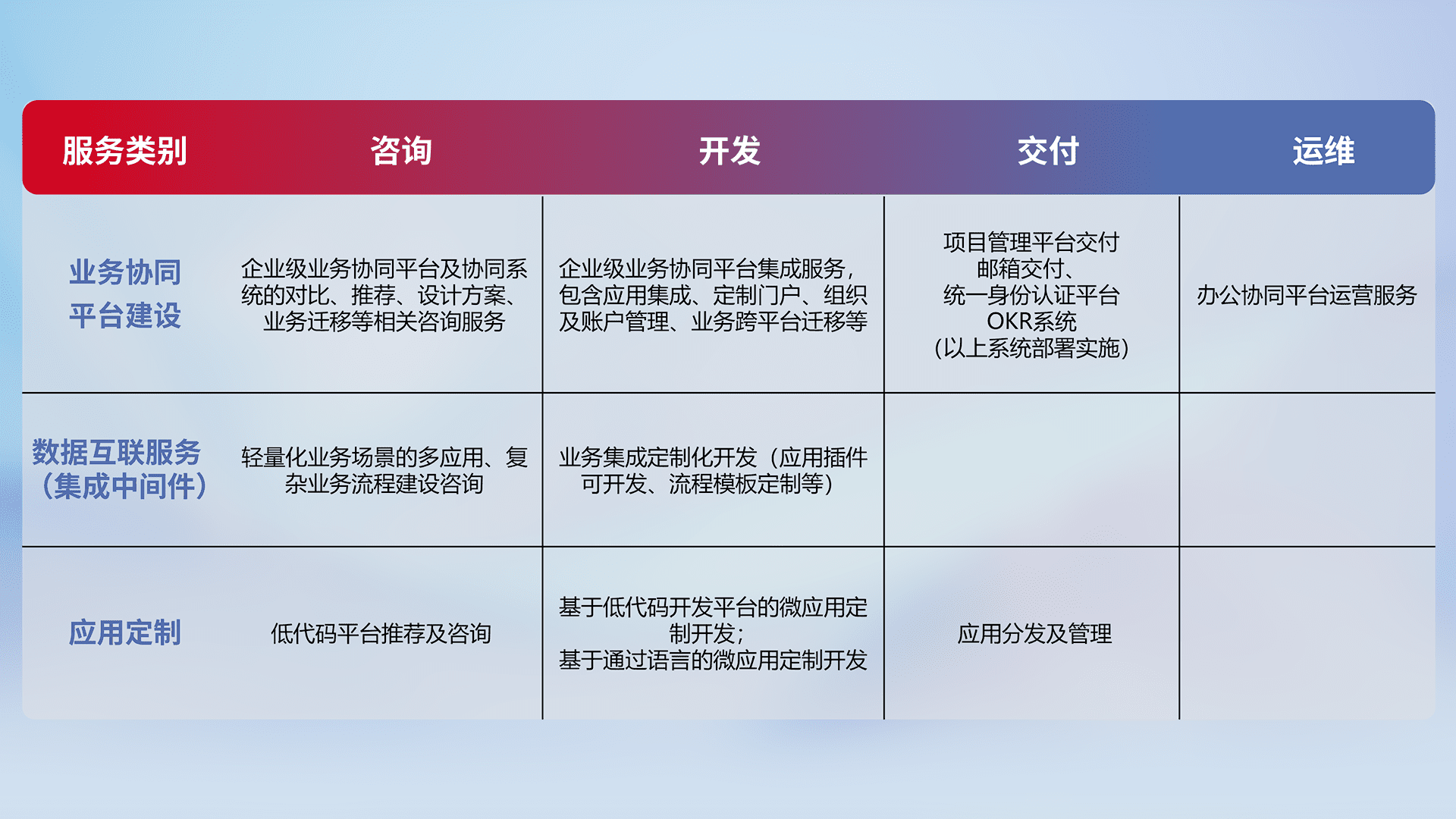 针对钉钉、、、、企微、、、IDaas等平台级产品提供产品的规划、、、、方案、、交付、、、定制化开发等服务,,,实现如统一协同办公、、、、智能客户服务、、混合会议管理、、智能数据查询、、等业务场景,,实现数字化转型。。。